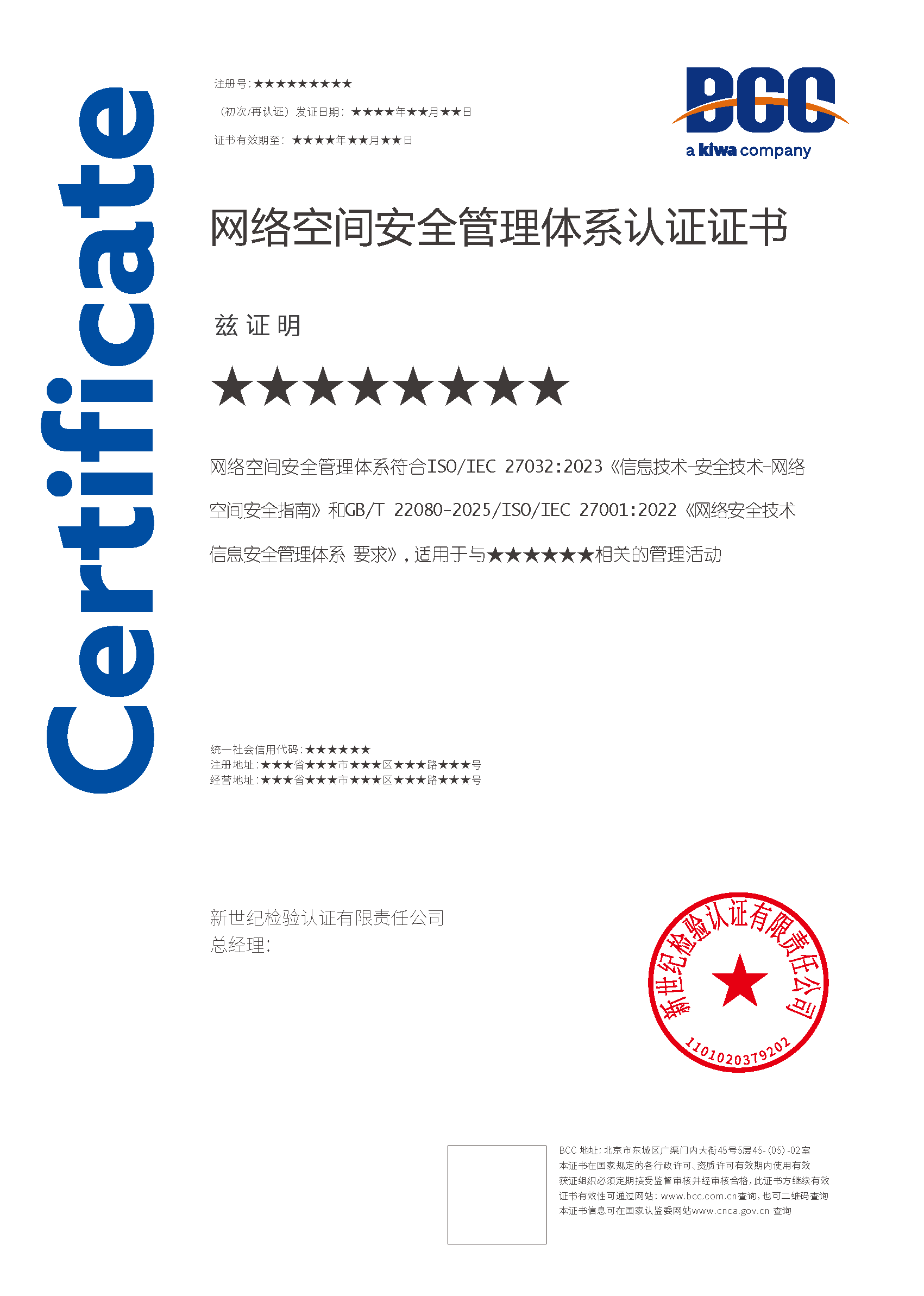 本頁涉及的認(rèn)證服務(wù)中均有對應(yīng)的《認(rèn)證實(shí)施規(guī)則》,BCC擁有其最終解釋權(quán)。任何組織及個(gè)人未經(jīng)BCC許可,不得以任何形式全部或部分使用(法律要求除外)認(rèn)證相關(guān)信息。如需獲取相關(guān)實(shí)施規(guī)則請用以下方式聯(lián)系獲?。弘娫挘?10-58579316   郵箱:fwjs@kiwa.cn