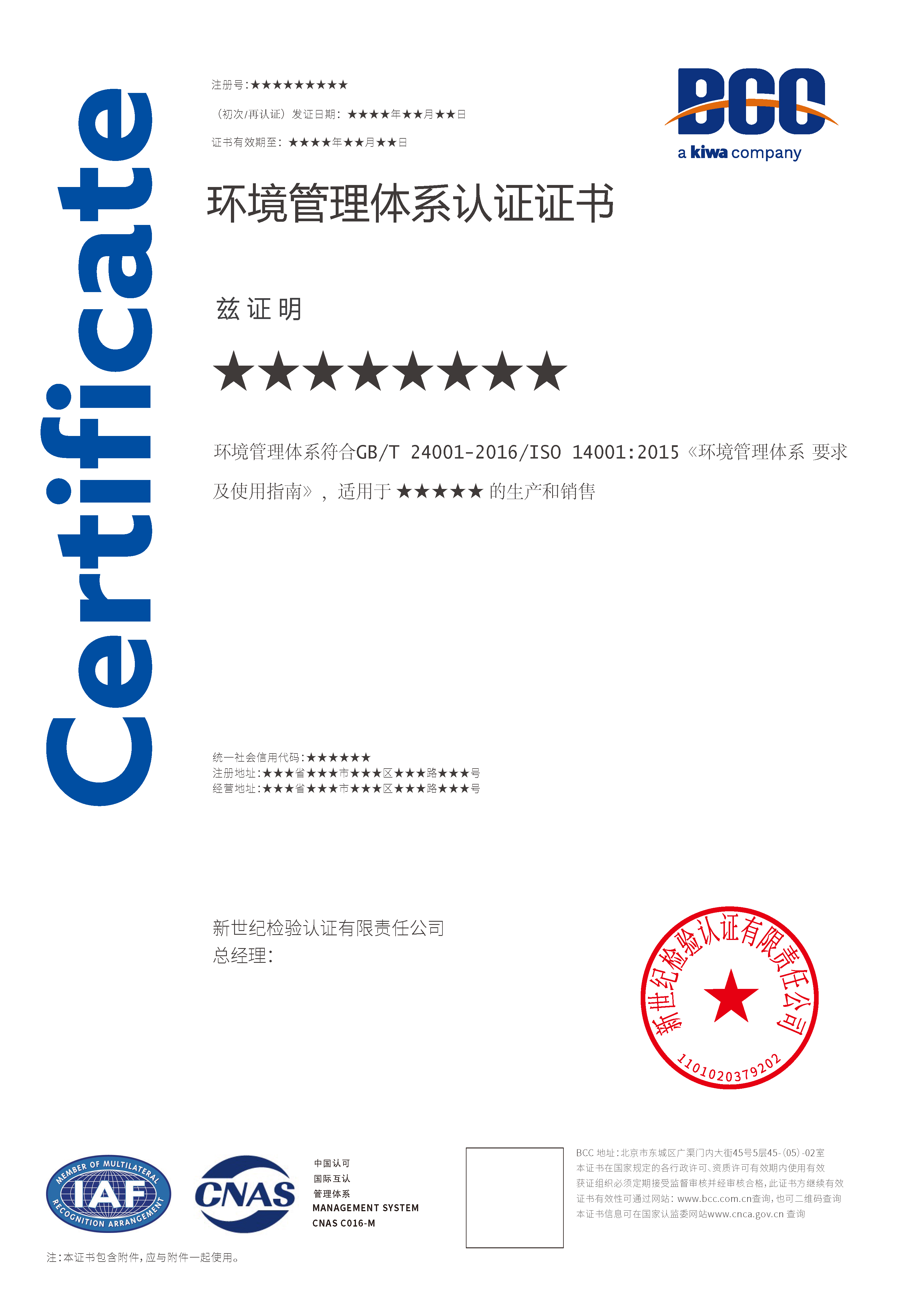環(huán)境管理體系證書(ANAB) 環(huán)境管理體系證書(CNAS)