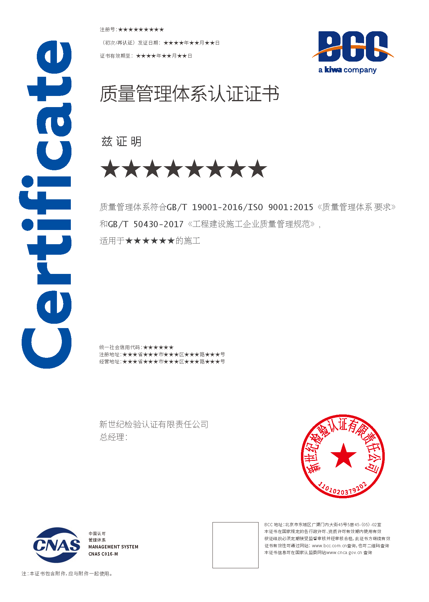 工程建設施工企業(yè)質量管理體系認證適用于建設施工單位(住建部頒發(fā)資質的施工企業(yè)),既可以用于施工總承包的單位,如:建筑工程、市政公用工程、電力工程、公路工程、鐵路工程、機電工程等;此外,還可用于專業(yè)承包的單位,如:防水防腐保溫工程、建筑裝修裝飾工程、消防設施工程、建筑幕墻工程、電子與智能化工程、建筑機電安裝工程、環(huán)保工程、鋼結構工程等。