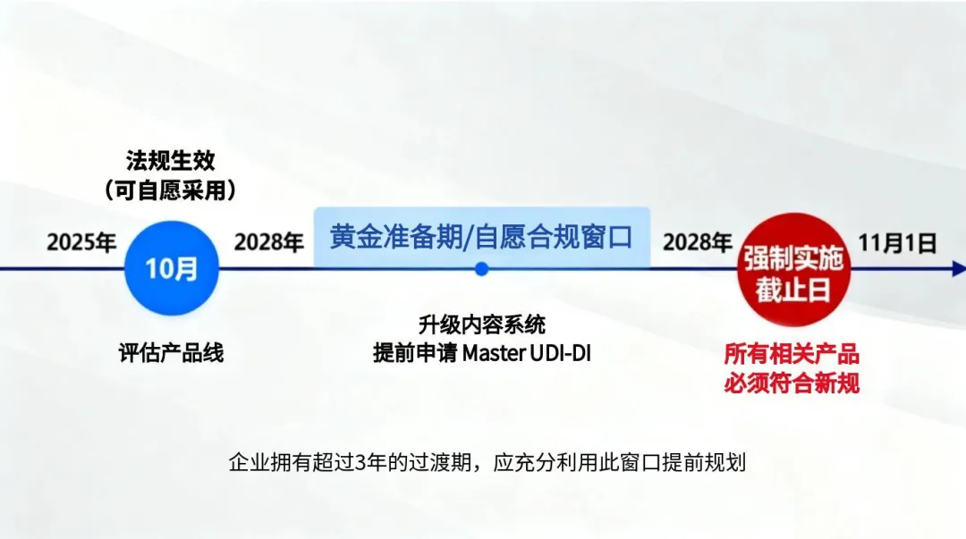 3. 提前合規(guī)窗口:法規(guī)允許制造商在 2028 年 11 月 1 日前,提前按照新規(guī)則分配 Master UDI-DI,為企業(yè)預(yù)留了充足的系統(tǒng)調(diào)整時(shí)間。