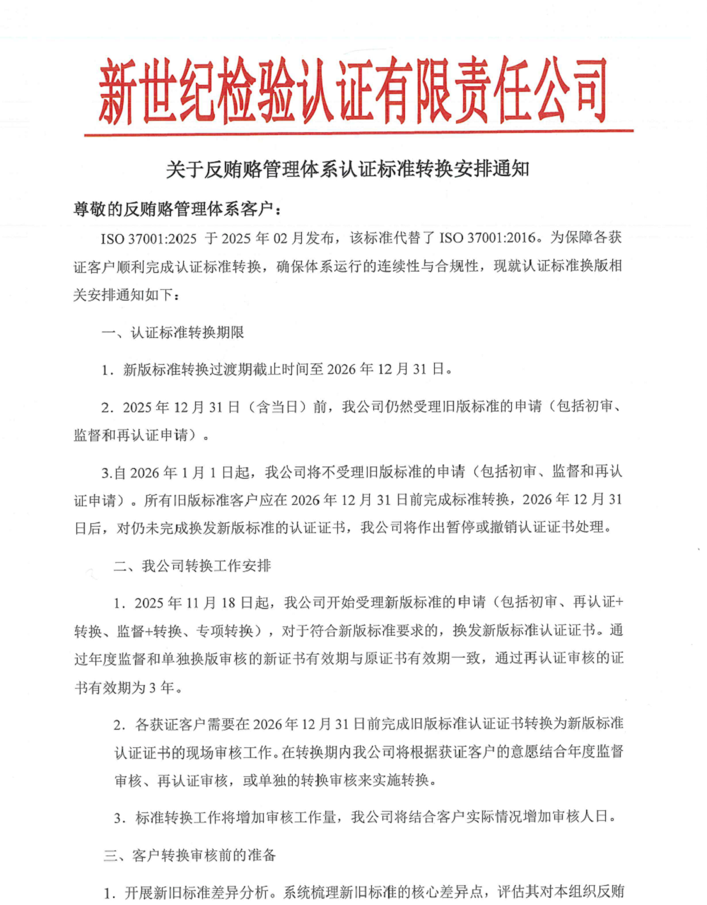 3.自2026年1月1日起,我公司將不受理舊版標準的申請(包括初審、監(jiān)督和再認證申請)。所有舊版標準客戶應(yīng)在2026年12月31日前完成標準轉(zhuǎn)換,2026年12月31日后,對仍未完成換發(fā)新版標準的認證證書,我公司將作出暫?;虺蜂N認證證書處理。