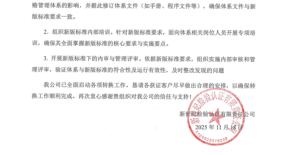 1.2025年11月18日起,我公司開始受理新版標準的申請(包括初審、再認證+轉(zhuǎn)換、監(jiān)督+轉(zhuǎn)換、專項轉(zhuǎn)換),對于符合新版標準要求的,換發(fā)新版標準認證證書。通過年度監(jiān)督和單獨換版審核的新證書有效期與原證書有效期一致,通過再認證審核的證書有效期為3年。